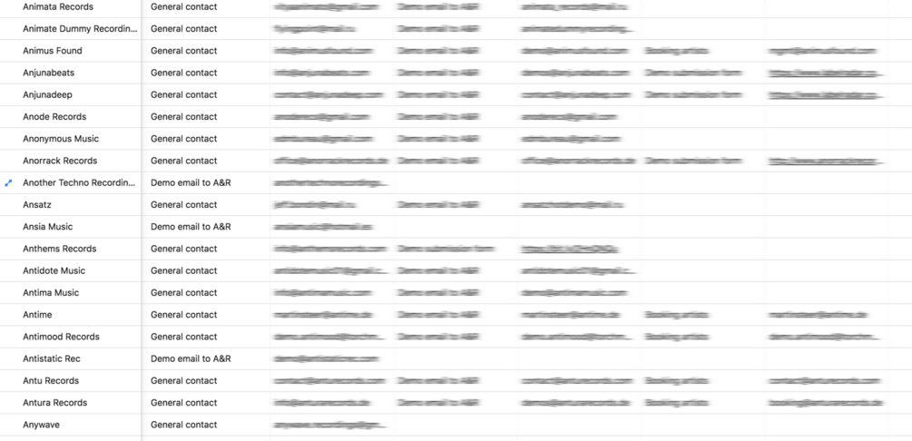 A massive database (over 5000+ entries) of underground music labels categorized by genre and location in an easy to navigate XLS/CSV sheet document.
